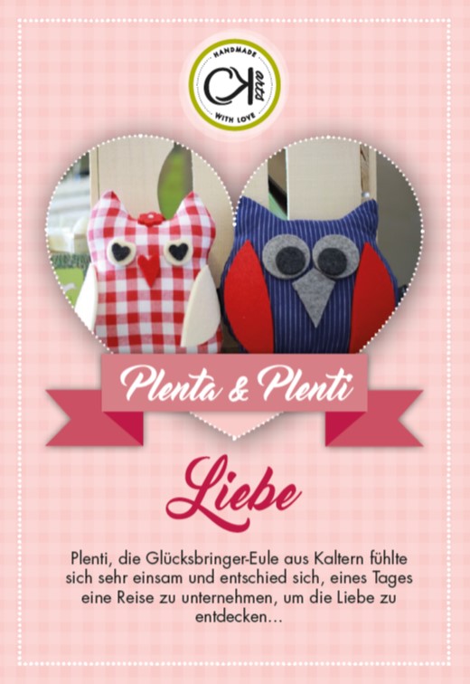 ...und entschied sich, eines Tages eine Reise zu unternehmen, um die Liebe zu entdecken. Die Eule flog Tag und Nacht und erkundete unbekannte Länder und Ozeane, traf vorher noch nicht gesehene Tiere und hörte neue Sprachen. Aber Sie fand niemanden, der in der Lage war das Eulenherz zum Schlagen zu bringen. Auf der Rückreise als Plenti über die Schweizer Alpen flog wurde Sie von der Schönheit einer kleinen roten Eule namens Plenta geblendet. Zwischen den beiden war es Liebe auf den ersten Blick, sie verbrachten Tag und Nacht zusammen, aber leider nur im Verborgenen. Plenti wurde von den Eltern der kleinen Eule nicht akzeptiert, weil er ein Fremder war. Sie sprach Schweizer Akzent, er Südtiroler Dialekt. Sie war rot, er blau. Sie aß Fondue, er Knödel. Es konnte nicht funktionieren. Eines Tages wurde die kleine rote Eule sehr krank. Alle Eulen im Dorf waren verzweifelt, denn sie konnten ihr nicht helfen. Plenti hatte eine Idee. Die Eule rupfte sich eine Feder nach der anderen aus und deckte Plenta damit zu um sie zu wärmen, wie es damals der alte Bauer aus Kaltern mit ihm gemacht hatte. Die Eule fühlte sich immer besser und wurde gesund. Die Eltern von Plenta sahen diese große Geste der Liebe und begriffen, dass die Farbe der Federn, die Sprache, die unterschiedlichen Bräuche - nicht wichtig waren. Die Liebe zwischen den beiden kleinen Eulen war stärker als alles andere. Plenti und Plenta flogen nach Kaltern und verbrachten glückliche und unbeschwerte Tage. Sie bewunderten den Sonnenuntergang vom Ufer des Sees aus. Plenti wuchsen von Tag zu Tag seine Feder wieder nach.
