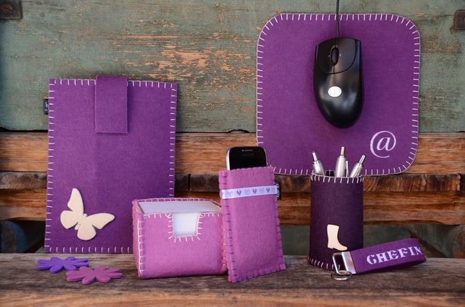 Molti oggetti di uso quotidiano in feltro per abbellire le vostre scrivanie e postazione di lavoro, come ad esempio il portapenne, tappetini per il mouse, astucci, portafoglietti, custodie per cellulari e pc, ecc.